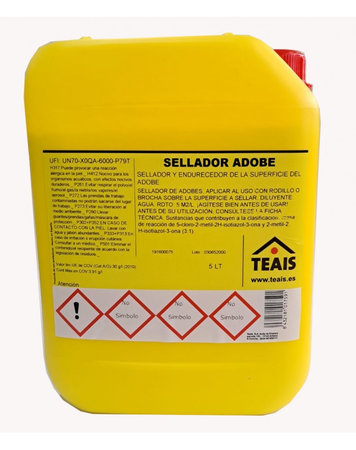 Sellador de adobe a base de disolución de resinas sintéticas que al aplicarse sobre adobes y paredes arenosas, sellan y endurecen su superficie, permitiendo la transpiración.