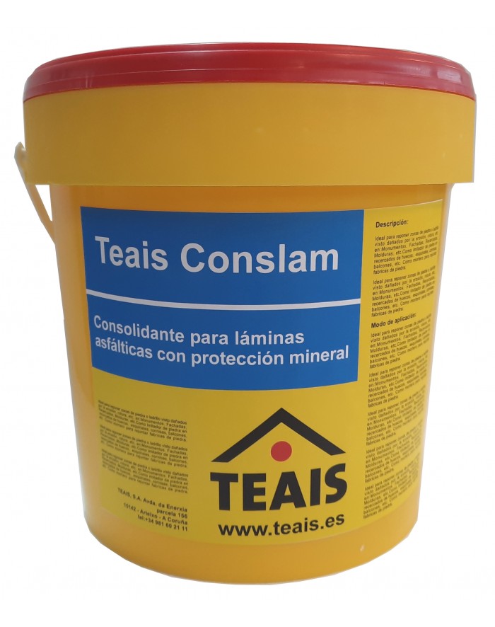 Teais Cosnlam es un consolidante acrílico base agua para fijación del árido mineral en láminas asfálticas y protección superficial de cubiertas. Producto líquido formulado a base de copolímeros acrílicos en dispersión acuosa, con aditivos protectores frente a radiación UV y agentes conservantes, diseñado para consolidar, fijar y proteger la capa mineral de láminas asfálticas, mejorando su durabilidad, estética y resistencia a la intemperie.